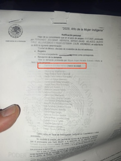 En el primer amparo colectivo que fue promovido de madrugada (1117/2025), aparece mencionado Fernando Escobar Herrera, identificado en el expediente como "menor de edad". La policía no distinguió objetivos: barrió parejo. Fernando fue liberado en la madrugada, un reconocimiento tácito del error, pero el hecho de que un niño tuviera que ser amparado por abogados para no quedar atrapado en el sistema penal exhibe la peligrosidad del operativo.