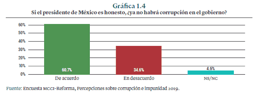 Entre estas valoraciones negativas del pasado y optimistas sobre el futuro, la campaña presidencial y el resultado de las elecciones de 2018 jugaron un papel determinante. En el discurso, Andrés Manuel López Obrador (AMLO) usó al combate a la corrupción como uno de sus principales estandartes, lo que tuvo eco en una ciudadanía harta y enfurecida con las administraciones previas. Fórmulas sencillas y simplistas, como la promesa de que la honestidad del presidente es suficiente para eliminar la corrupción o la propuesta de crear una constitución moral como un mecanismo para cambiar el comportamiento de las personas, fueron tan potentes y exitosas que, actualmente, alrededor de 60% de las personas están de acuerdo con estas ideas.