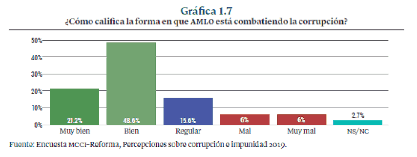 La nueva administración, y en particular el presidente, ha comenzado a gobernar no sólo con un amplio respaldo ciudadano, que se observa en que 78% de los encuestados aprueban el trabajo de AMLO en general, sino con una percepción considerable de que está combatiendo a la corrupción de una manera adecuada: casi 70% cree que lo está haciendo bien o muy bien, mientras que sólo 12% tiene una apreciación negativa.
