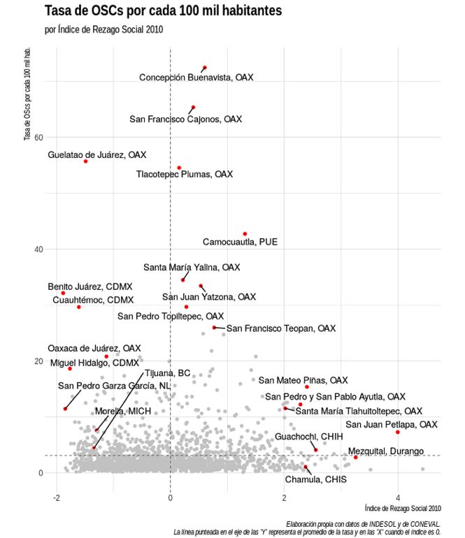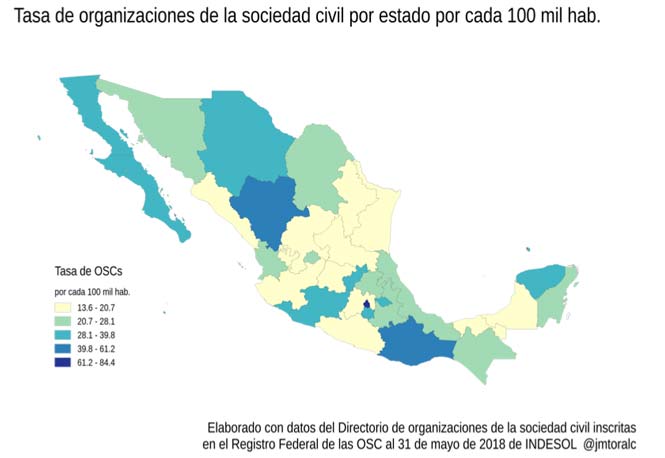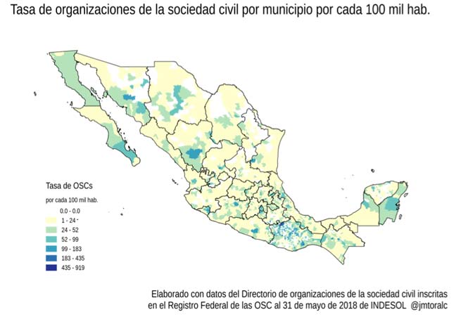 Usar una tasa para medir las OSC enfatiza su dispersión en las regiones pocos pobladas. Por ejemplo, existen casos como Concepción de Buenavista, un municipio de la Sierra Mixteca en Oaxaca, en un municipio de poco más de 800 personas tiene 6 OSC o San Francisco Cajonos que, teniendo poco más de 300 personas, tiene una organización.