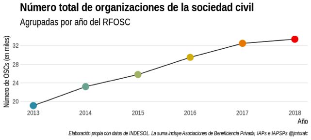 Ha habido un aumento significativo en el número de organizaciones de la sociedad civil desde 2013. Mientras que en este año había menos de 20 mil organizaciones con registros vigentes, en 2018, había más de 32 mil, según el RFOSC. Es importante resaltar que la tasa de crecimiento pierde impulso entre 2017 y 2018 del RFOSC.