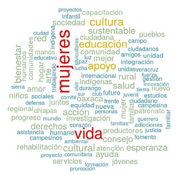 Si bien el nombre de la organización no necesariamente hace explícita su vocación o acciones, es posible aproximarse a los temas más recurrentes a través de su análisis. Luego de retirar palabras comunes como “fundación”, “centro”, “asociación”, “México”, entre otras, es posible identificar algunos temas. Por ejemplo, la palabra “mujer” es una de las que más sale a relucir, seguida de “vida”. En un segundo grupo de frecuencias se encuentra “educación” y “cultura”. Finalmente, es posible identificar un tercer grupo más diverso de palabras, en las que resaltan algunas como “jóvenes”, “niños”, “sustentable” y “rehabilitación”.