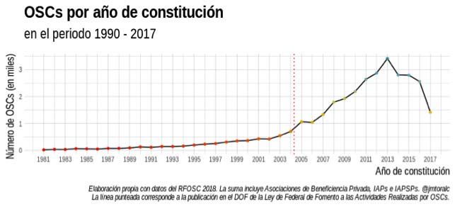 En el RFOSC existen registros de organizaciones fundadas a inicios del siglo XX, como la encargada de la operación del Hospital de la Luz, constituido en 1902. Desde entonces el crecimiento en el número de OSC ha sido constante a lo largo del tiempo, particularmente después de la publicación de la Ley de Federal de Fomento a las actividades realizadas por Organizaciones de la Sociedad Civil en 2004.