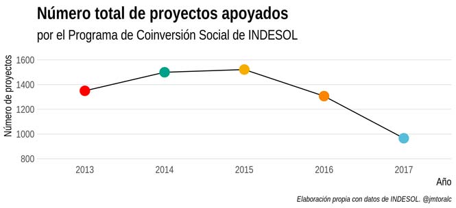 2017 ha sido el año en el que ha habido menos proyectos de coinversión. Mientras que en 2013 fueron financiados cerca de 1,400 proyectos, en 2017 apenas fueron 966. Esto representa una reducción de poco más de una tercera parte en el número de proyectos de 2013 a 2017.