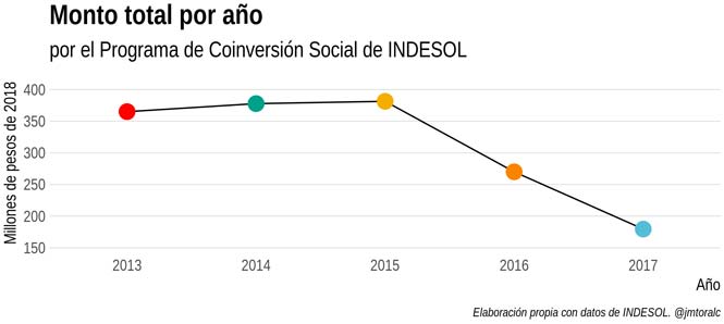 Esta reducción tiene su reflejo en el monto total que se destinó a este programa. Mientras que en 2015 se destinaron 270 millones de pesos (constantes de 2018) para el apoyo de estos programas, en 2017 esta cifra se redujo a 180 millones de pesos, una reducción de 33%.
