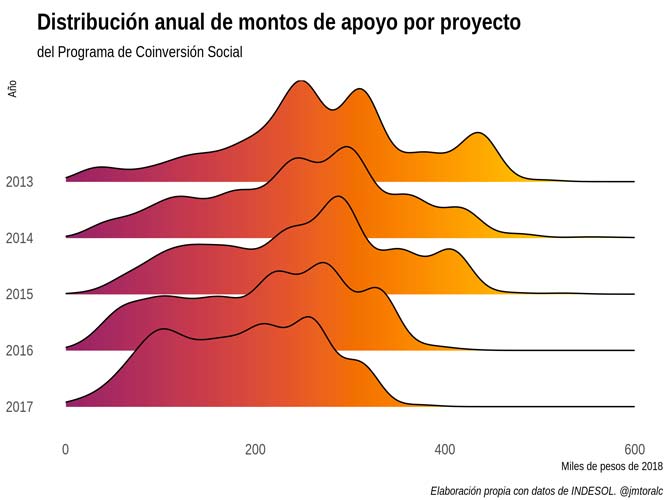 Estas reducciones no sólo fueron por los montos totales y el número total de proyectos, es posible observar que los montos por proyecto también se redujeron. Mientras que en 2013 el monto promedio fue de 271 mil pesos, en 2017 se redujo a 186 mil. Es posible observar que esta reducción puede ser explicada en gran medida por la desaparición de apoyos mayores de 300 mil pesos. También se puede observar cómo se contraen la distribución de los montos hacia la izquierda y pierden altura, lo que muestra menos montos para menos organizaciones. Es decir, no sólo se redujeron las organizaciones financiadas, sino también el monto que se les asigna a las que sí logran conseguir fondos.
