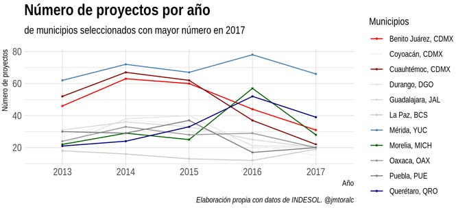 No es sorpresa que Yucatán tenga números positivos, Mérida es uno de los municipios con más proyectos de esta naturaleza y durante 5 años seguidos —los que componen esta base de datos— ha sido el municipio con mayor número de proyectos. Pese a la reducción en el número de proyectos durante 2017, Mérida mantuvo su lugar como el primer proponente. Es importante notar la caída en las entonces delegaciones de Benito Juárez y Cuauhtémoc a lo largo del tiempo, así como el gradual avance del municipio de Querétaro y el notable aumento de Morelia en 2016, para luego caer en 2017.