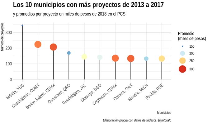 Si bien Mérida es el municipio con mayor número de proyectos, en promedio los proyectos en ese municipio de 2013 a 2017 recibieron poco más 150 mil pesos, mientras que Benito Juárez, Oaxaca de Juárez, Coyoacán y Cuauhtémoc recibieron 288 mil, 285 mil, 280 mil y 277 mil pesos de 2018 por proyecto en promedio.