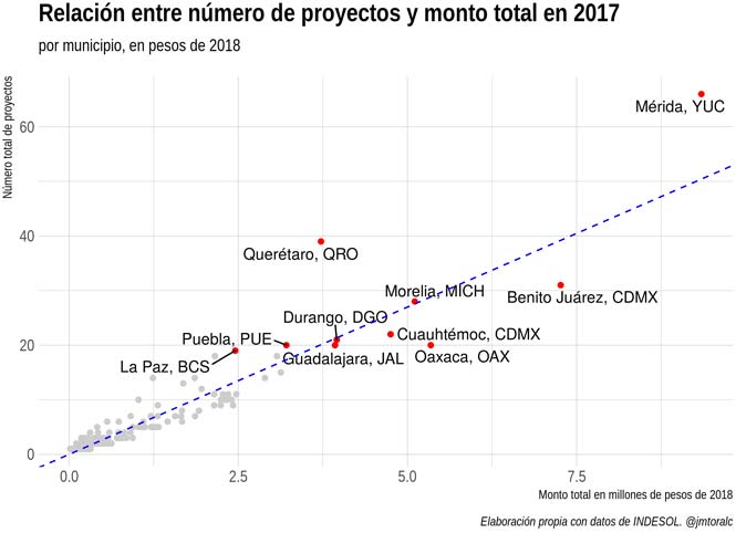 Lo anterior significa que algunos municipios lograron acceder a más recursos que otros en cuanto a los proyectos que ejecutan las organizaciones que tienen domicilio fiscal en su ámbito territorial. La siguiente gráfica muestra la relación entre proyectos y montos en 2017. Es posible ver, por ejemplo, que pese a que La Paz, Baja California Sur y Cuauhtémoc, en la Ciudad de México, tienen cantidades similares de proyectos, la primera obtuvo casi 2.5 millones, mientras que la segunda casi duplica esa cantidad.