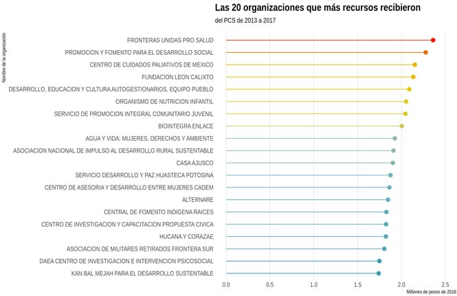 Fronteras Unidas Pro Salud, de Tijuana, Baja California, es la organización que más recursos ha recibido: 2.4 millones de pesos de 2018 en el periodo de 2013 a 2017. En segundo lugar se encuentra Promoción y Fomento para el Desarrollo Social en Comitán, Chiapas con una suma de 2.3 millones de pesos de 2018. El tercer sitio es ocupado por el Centro de Cuidados Paliativos en el barrio de San Pedro, en la Alcaldía de Iztacalco en la Ciudad de México1 con 2.15 millones de pesos. La siguiente visualización recolecta las 20 primeras organizaciones.