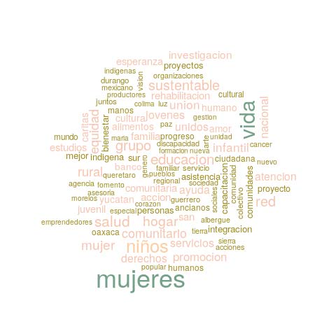 El nombre de la organización que presenta el proyecto puede darnos algunas pistas sobre los temas más tratados en los proyectos del PCS. La nube de palabras que se presenta a continuación es muy similar a la presentada en la primera parte de esta serie de artículos en el que las palabras “vida” y “mujeres” también sobresalían una vez retiradas palabras genéricas como “asociación” u “organización”. En el segundo grupo, no obstante, aparecen temas relacionados con niñez, equidad, sostenibilidad, comunidades y educación. En un tercer nivel de frecuencias aparecen temas como género, cáncer y paz.
