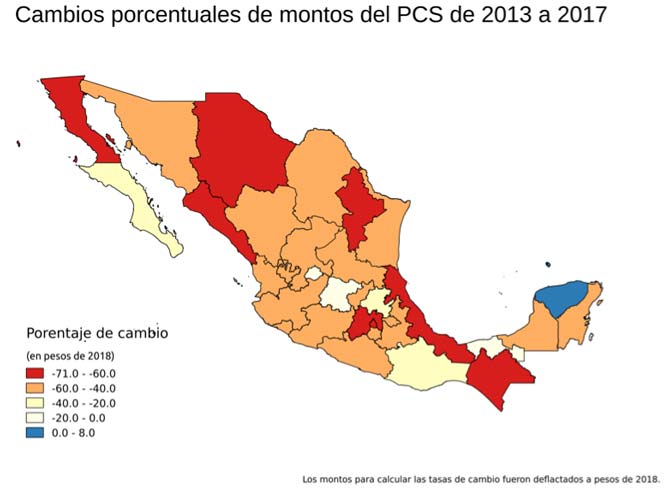 Todas las entidades federativas han sido afectadas por la contracción de montos de Indesol de 2013 a 2017, con excepción de Yucatán. En este periodo, los estados de Sinaloa, Baja California, Chihuahua, Nuevo León, Veracruz, el Estado de México, la Ciudad de México y Chiapas han visto reducidos los apoyos entre 60% y 70%.