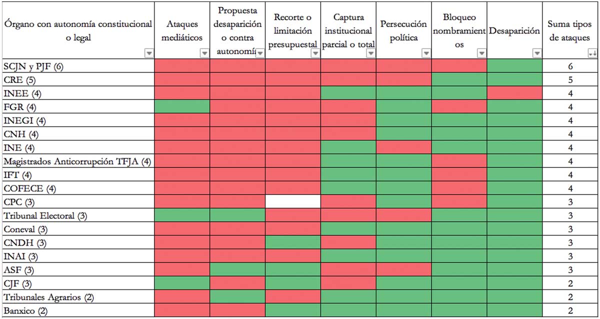 Miguel Alfonso Meza realizó una sistematización de los ataques a los órganos autónomos que resulta útil para este estudio. En ésta, enlista quince órganos autónomos que han sido blanco de seis tipos de ataques: golpes mediáticos, propuesta de desaparición o de cese de autonomía, recorte presupuestal, captura institucional parcial o total, bloqueo de nombramientos, y desaparición. Meza manifiesta todo lo anterior en la siguiente gráfica: