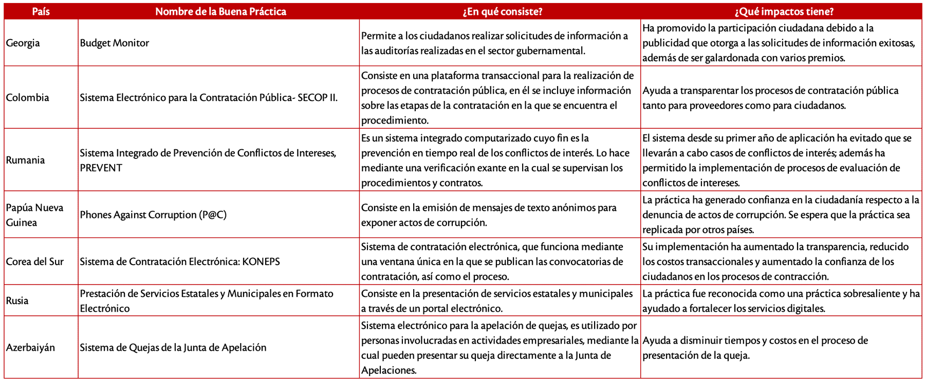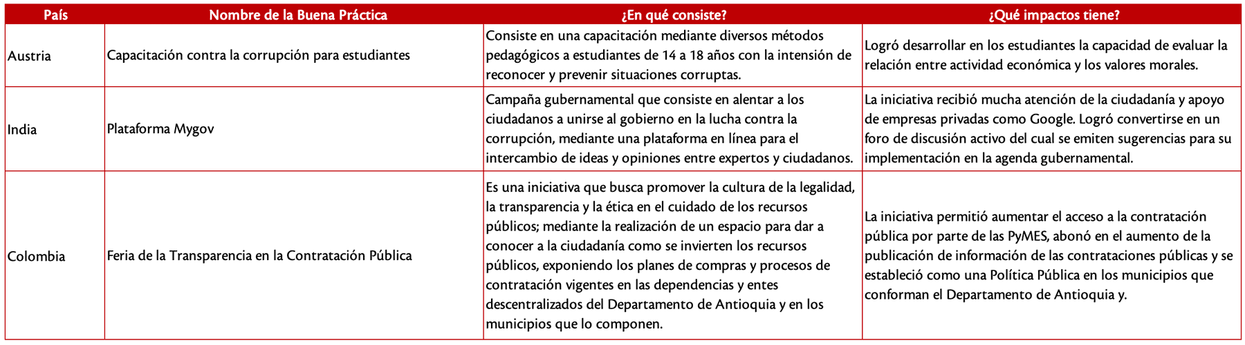 Fuente: elaboración propia con base en la información contenida en el Banco de Buenas Prácticas Internacionales en el Combate a la Corrupción