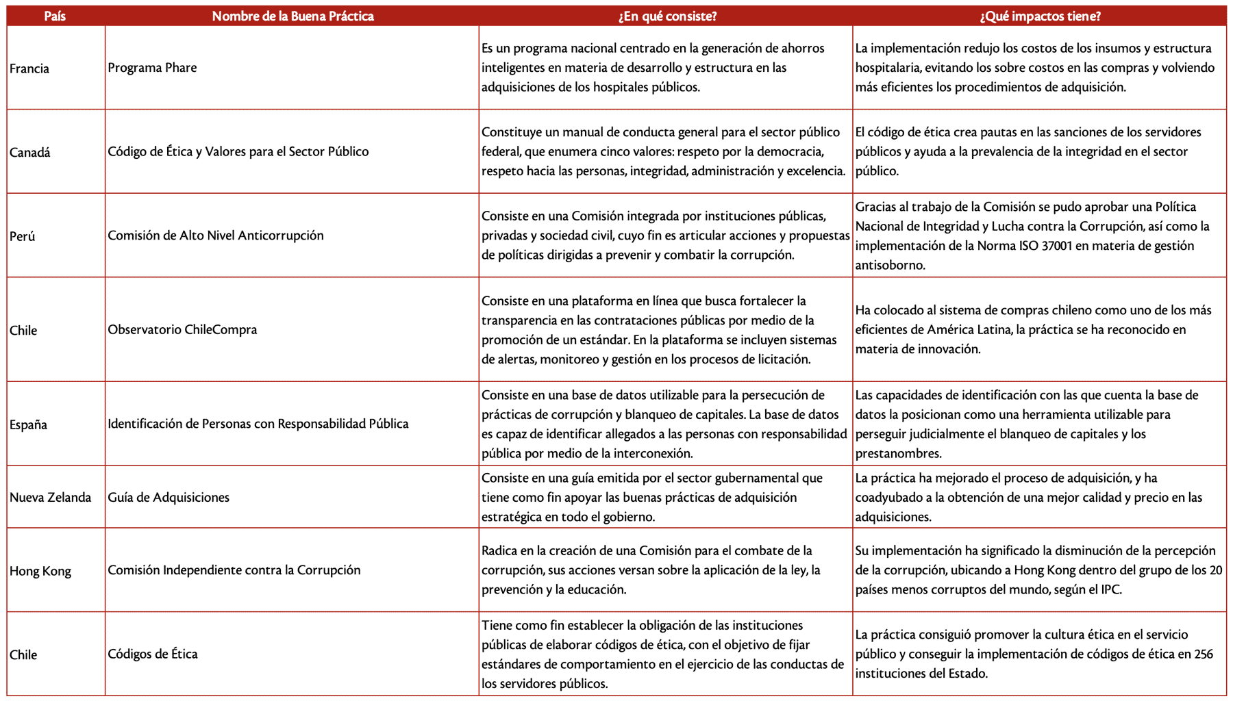 Este rastreo de buenas prácticas deriva, principalmente, de analizar aquellos países con los mejores puntajes en el Índice de Percepción de la Corrupción (IPC), y de analizar las acciones o iniciativas gubernamentales que han sido reconocidas a nivel internacional. En este sentido, los países seleccionados gozan de una buena reputación en la percepción que sus ciudadanos tienen respecto al impacto de la corrupción en su vida diaria, por lo cual las fichas son una instantánea de sus rasgos más característicos.
