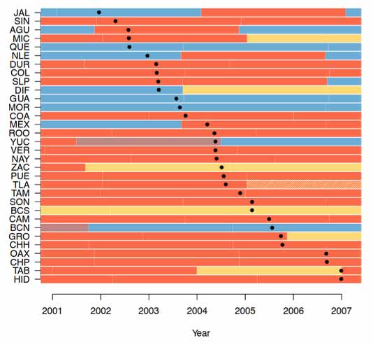 Uno de los hallazgos más sorprendentes de los autores es el tiempo institucional en el que estas reformas tuvieron lugar en los periodos de transición entre una legislatura y otra, legislaturas de pato cojo en el argot de la ciencia política. Esto conlleva a la conclusión de que las legislaturas siguen una lógica de seguro en la que toman previsiones para poder seguir incidiendo en la siguiente legislatura. Aunado a lo anterior, los autores sugieren que mientras que los estados con gobernadores priistas fueron los más reticentes a aprobar estas leyes, las legislaturas del otrora partido más importante del país fueron las más activas para aprobarlas. Es posible ver el momento exacto de aprobación de las leyes de acceso a la información en la Figura 2.1 Cada punto representa el momento en que cada ley de transparencia fue aprobada por la legislatura local y cada color, el partido que tenía mayoría: rojo para el PRI, azul para el PAN, amarillo para el PRD y líneas diagonales correspondientes a cada partido en caso de que se diera un empate entre dos grupos en el congreso local.