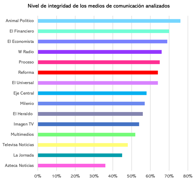 Posteriormente, aplicamos la metodología a quince medios de comunicación de alcance nacional y obtuvimos su nivel de percepción de integridad. Tres de ellos —Televisa Noticias, La Jornada y Azteca Noticias— obtuvieron calificaciones reprobatorias.