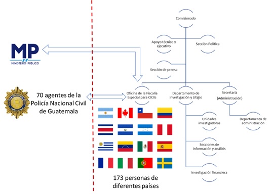 Además, la CICIG estuvo integrada por 173 personas procedentes de Argentina, Canadá, Chile, Colombia, Costa Rica, El Salvador, España, Francia, Honduras, Italia, México, Perú, Portugal, Suecia, Uruguay y Venezuela. La Comisión también contó con apoyo de 70 agentes de la Policía Nacional guatemalteca, los cuales cumplían con funciones de investigación y seguridad e integraban una unidad de policía que apoya la Oficina de Fiscalía Especial para la CICIG (UEFAC), que fungía como el vínculo y canal de comunicación directo entre el Ministerio Público y la CICIG.