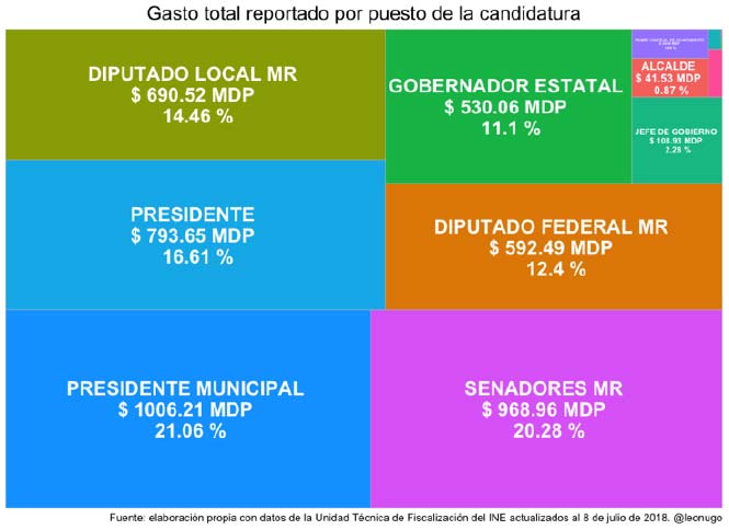 Al agrupar a todos los candidatos por el cargo que competían podemos ver que los candidatos presidenciales dicen haber gastado 793 millones de pesos; sin embargo, esta no es la competencia que acumula más gastos, ya que en conjunto los candidatos al Senado y a las presidencias municipales reportan haber gastado 968 y 1,006 millones de pesos, respectivamente. Resulta llamativo que también las competencias a las gubernaturas fueron, en el papel, menos costosas que las de otros cargos: todos los candidatos a gobernador reportan haber gastado 530 millones de pesos, mientras que los diputados federales dicen haber gastado 592 millones y los diputados locales 690 millones.