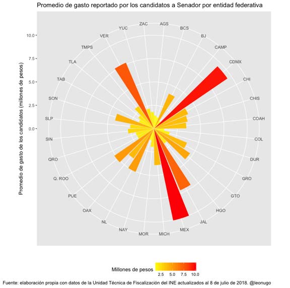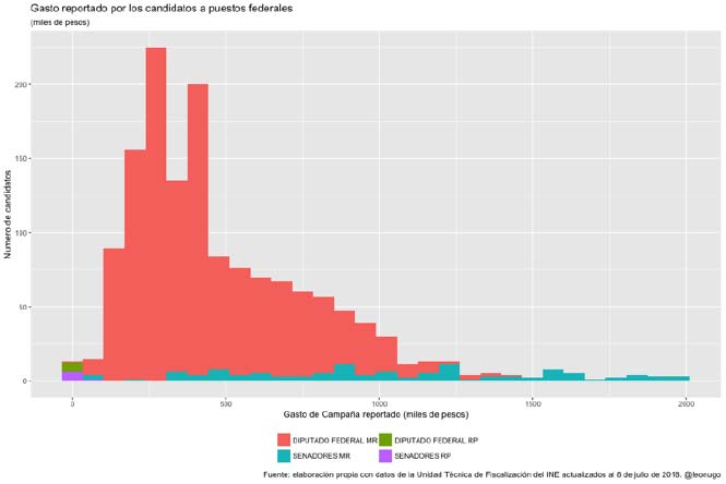 Otra forma de ver estos datos es promediar el gasto declarado por todos los competidores del mismo cargo, sin importar su ubicación geográfica ni su partido. Los candidatos presidenciales dicen haber gastado, en promedio, 158 millones de pesos; los candidatos a Jefe de Gobierno, 15 millones y los candidatos a gobernador reportan haber gastado 12 millones de pesos. En contraste, resulta muy llamativo ver que los candidatos plurinominales a la Cámara de Diputados que reportaron operaciones dicen haber gastado 3 mil pesos y los candidatos plurinominales al Senado dicen haber gastado, en promedio, 16 mil pesos.