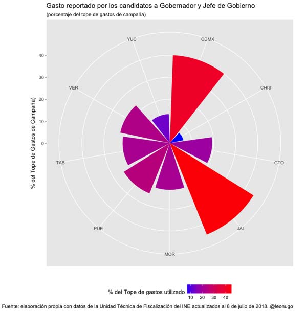Algo similar sucede con las competencias a las gubernaturas y a Jefe de Gobierno, aunque en este caso los candidatos dicen haber utilizado, en promedio, 23.8% de su tope de gastos de campaña. En el extremo inferior, los candidatos de Chiapas, que tenían un tope de gastos de 85.2 millones de pesos, dicen haber gastado sólo 6.4% de este límite, mientras que los estados cuyos candidatos dicen haber gastado más, la CDMX y Jalisco, dicen haber usado 40 y 44 por ciento de sus topes, que fueron de 30.2 y 28.6 millones de pesos, respectivamente.