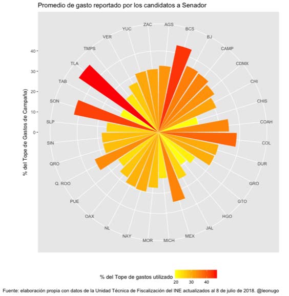 Pero al comparar con el límite de gastos, en promedio los candidatos al Senado reportaron haber gastado 30% de lo que podían haber utilizado y los estados con mayores gastos netos terminan comportándose como la mayoría, destacando sólo que las campañas de Baja California, Sonora y Tlaxcala superaron este umbral, pero manteniéndose debajo del 40%. Es decir, en sus reportes todos los candidatos fueron “austeros”.