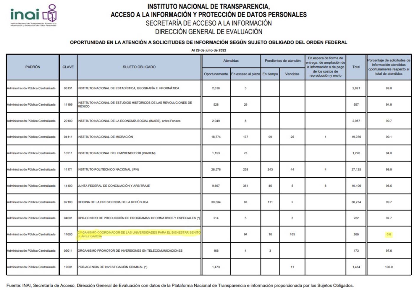 Además, el Organismo Coordinador de las UBBJ es el único sujeto obligado de la administración pública federal con una calificación de cero sobre cien en atender solicitudes de información pública a tiempo, de acuerdo con el INAI. Pese a ser creado en el segundo semestre de 2019, el organismo no realizó los procedimientos necesarios para ser dado de alta en la PNT en ningún momento de 2020, como lo prueba un oficio interno (INAI/SAI/DGEPPOED/0811/2020). De acuerdo con la PNT, la primera solicitud de información que la dependencia contestó fue en mayo de 2022, dos años después de su creación.