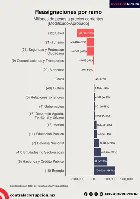 En la siguiente gráfica pueden verse los cambios en el gasto total de los diferentes ramos que componen al Poder Ejecutivo. En color rojo se identifica a cuáles dependencias se les quitó dinero que ya tenían legalmente autorizado, mientras que en color azul se ven las que fueron beneficiarias de esos desvíos. Debería ser un escándalo que entre las dependencias más afectadas está la Secretaría de Salud, que terminó ejerciendo 50% menos de todo el dinero que debió haber gastado o que la Secretaría de Seguridad y Protección Ciudadana ejerció 41% menos recursos. En contraste, es muy claro que los beneficiarios son instituciones como la Secretaría de Energía o la Secretaría de la Defensa Nacional.