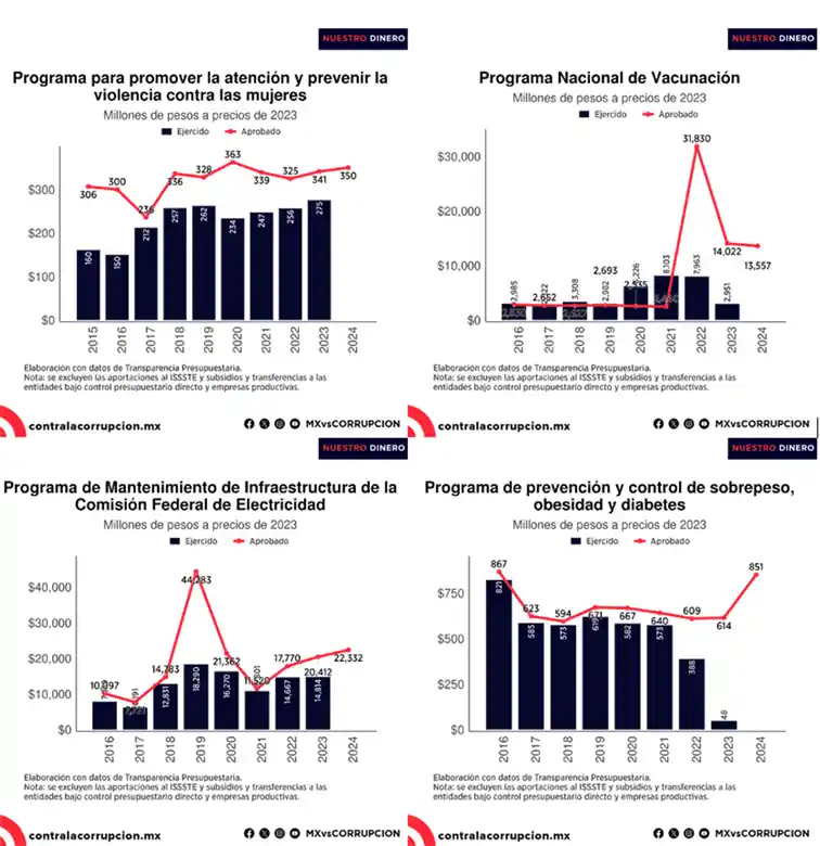 En los análisis que hacemos en la Unidad de Investigación Aplicada de MCCI, como parte del proyecto de Nuestro Dinero, damos seguimiento a cambios y problemas de gasto en instituciones o políticas públicas concretas. Este no es el espacio para hacer un desglose pormenorizado, pero sépase que en cada problema público que se ha agravado en este sexenio hay un componente de desvío de recursos mediante el mecanismo descrito. A manera de ejemplo, las siguientes cuatro gráficas muestran esa diferencia entre lo que decía el PEF (representado por las líneas rojas) y lo que realmente se gastó (en barras azules). La distancia entre ambas cifras cada año es el ejemplo de un problema público para el que el gobierno decidió gastar menos recursos.