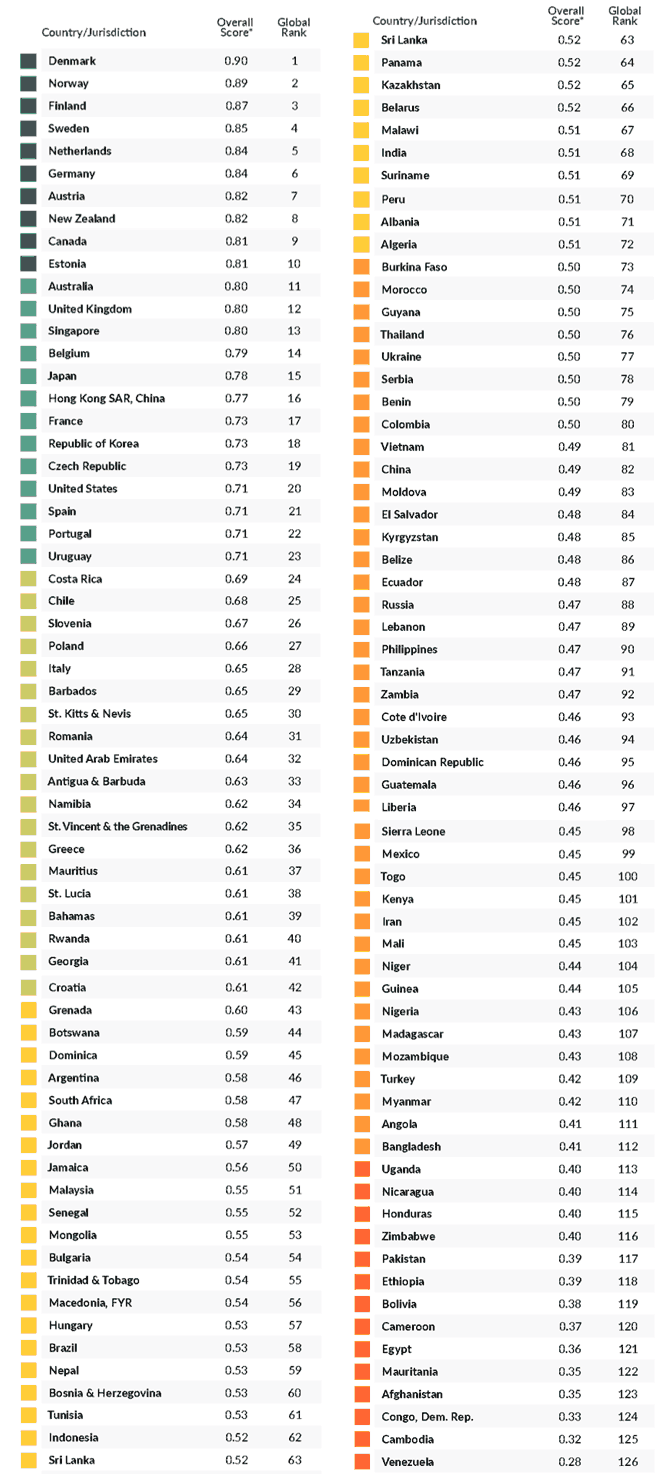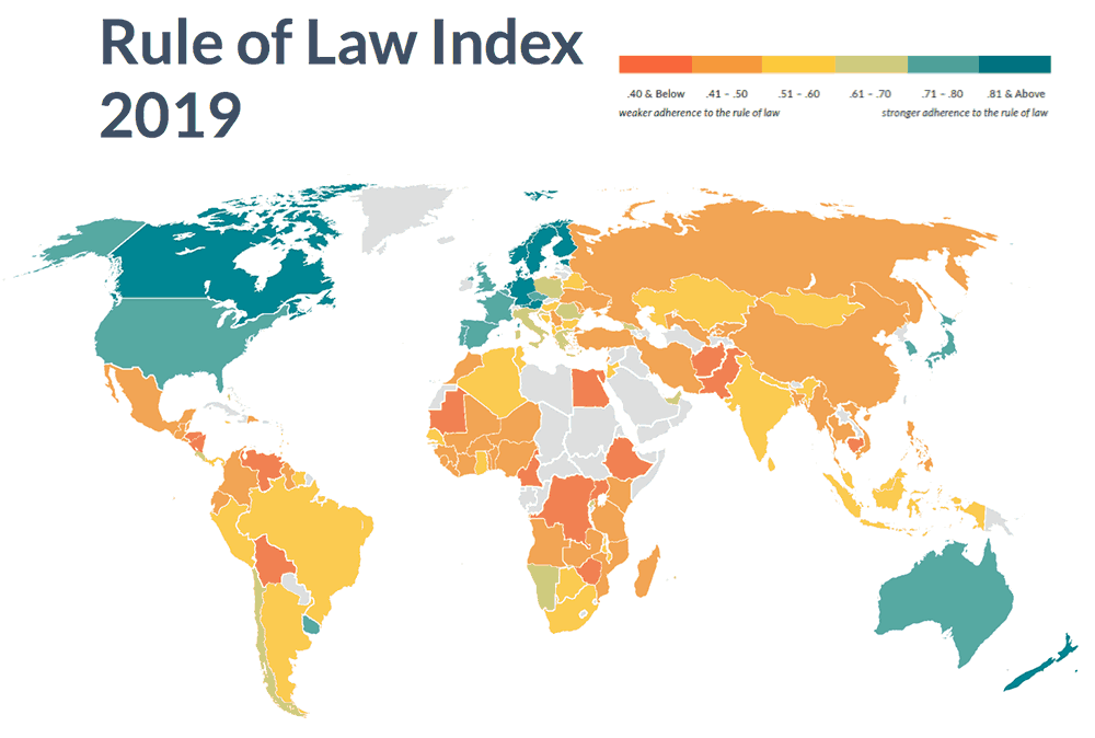 A nivel global, los países mejor calificados en el Índice de Estado de Derecho 2019 son Dinamarca, Noruega y Finlandia, y los últimos tres son República Democrática del Congo, Camboya y Venezuela. A nivel regional, en América Latina y el Caribe, el país mejor posicionado del Índice fue Uruguay (23 de 126), seguido por Costa Rica (24) y Chile (25). Los tres países con peor puntaje en la región son Honduras (115), Bolivia (119) y Venezuela (126).