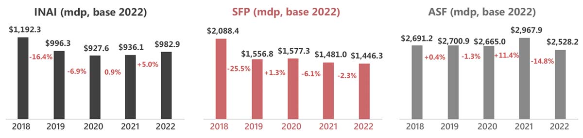 Gráfica 3. Evolución 2018-2022 del presupuesto del INAI, SFP y ASF, mdp constantes (base 2022) y variación porcentual real