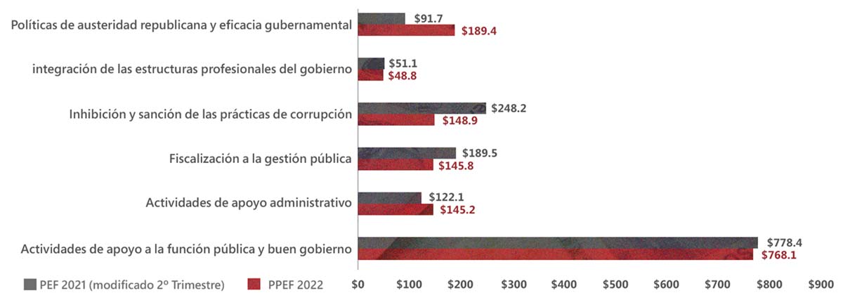 Como se observa, para 2022 se propone una disminución de 40 % para el programa “Inhibición y sanción de las prácticas de corrupción”; de 23.1 % para “Fiscalización a la gestión pública” para practicar auditorías a la Administración Pública Federal (APF), y de 4.4 % al presupuesto del programa “Integración de las estructuras profesionales del gobierno”, que tiene por objeto fortalecer el servicio profesional de carrera. En contraste, se contempla un incremento de 106.5 % para “Políticas de austeridad republicana y eficacia gubernamental”, destinado a establecer mecanismos que promuevan, a través de la vigilancia y control de la mejora de la gestión pública de la APF, criterios de austeridad y generación de ahorros presupuestarios de los recursos públicos.