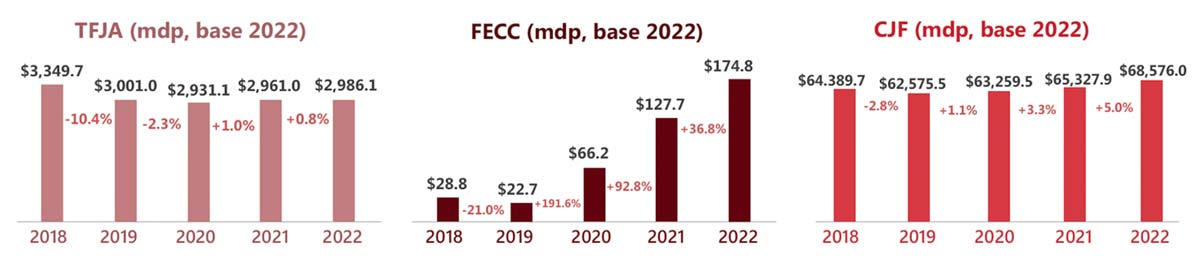 Gráfica 6. Evolución 2018-2022 del presupuesto del TFJA, FECC y CJF, millones de pesos constantes (base 2022) y variación porcentual real