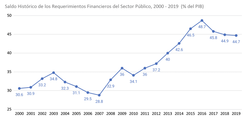 Sin embargo, un balance primario positivo no quiere decir que todo sea miel sobre hojuelas. Sólo es un indicador de la posición presupuestal del gobierno y puede cambiar cuando se considera el costo del servicio de la deuda y el resto de pasivos del gobierno. La medida más robusta para entender el balance público con estas consideraciones son los Requerimientos Financieros del Sector Público (RFSP) que, por ejemplo, se estima que para 2020 serán de 678 411 mdp (2.6 % del PIB). Es decir, aun cuando la posición fiscal del gobierno implica gastar menos de lo que ingresa en su operación diaria, en el saldo final requiere aún más recursos para hacer frente a todas sus obligaciones, por lo que el saldo es negativo.