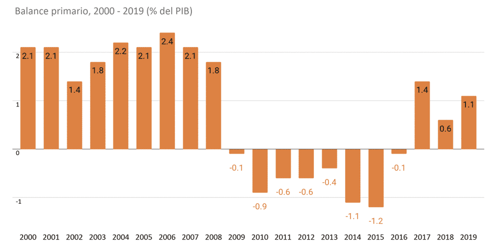 Precisamente por ello, cuando el balance primario disminuye hasta convertirse en deficitario, como sucedió entre 2009 y 2016, la deuda total del gobierno se dispara. El mayor incremento en el saldo histórico de la deuda, que en la primera década se mantuvo alrededor de 30 puntos del PIB, se dio justo en esos años y llegó al punto más alto de 48.7 % del PIB en 2016.