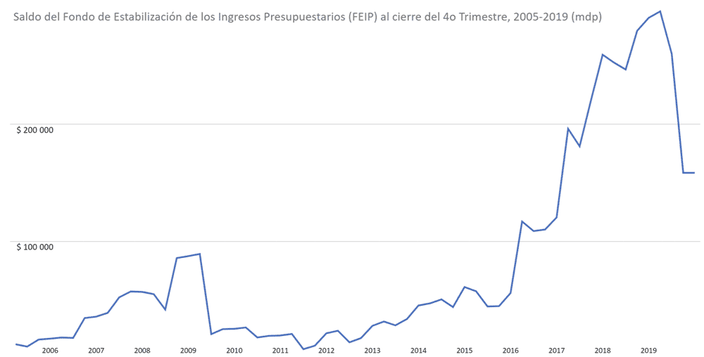 El modo en que ambas situaciones —la caída en los ingresos y la continuidad del gasto en las prioridades del Ejecutivo— pudieron mantenerse fue posible gracias al uso del Fondo de Estabilización de Ingresos Presupuestarios (FEIP): una bolsa que a lo largo de los años ha acumulado recursos provenientes de excedentes petroleros, el remanente de operación del Banco de México, entre otros ingresos adicionales, y que puede ser utilizado cuando los ingresos del gobierno caen de manera inesperada. Al cierre de 2018, el FEIP tenía un saldo de 279 mil mdp corrientes. Sin embargo, durante 2019 se anunció que, ante la caída en los ingresos esperados del gobierno, se utilizaría una parte de estos recursos. De acuerdo con el último informe trimestral de Hacienda, el saldo actual del FEIP es de 158 mil millones de pesos. Es decir, se utilizaron alrededor de 123 mil millones de pesos (43 % de los recursos del FEIP o 0.5 % del PIB) y se ha anunciado que, en caso de otra caída en los ingresos previstos (como seguramente sucederá), se volverá a utilizar para dejarlo prácticamente en ceros.