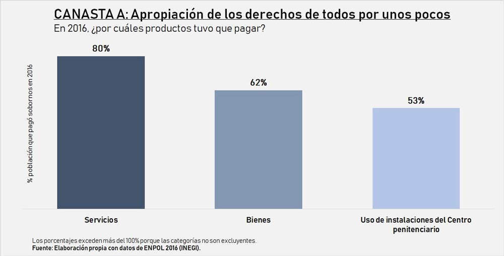 La cotidianeidad en los centros penitenciarios transcurre entre actos de corrupción y complicidades. Los datos de la ENPOL sugieren que 90%, de las 22,708 personas que reconocieron haber pagado a las autoridades en 2016, lo hicieron para tener acceso a bienes o servicios que la ley contempla como una obligación del Estado.