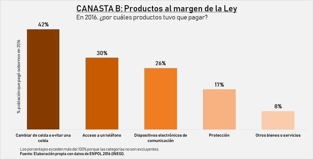 En 2016, 63% de los que declararon haber dado dinero fue para obtener bienes y servicios de la canasta B. Si bien, buena parte de estos pagos están destinados para comprar seguridad ―servicio ilegal cuya existencia está justificada por el clima de violencia y el autogobierno de los centros penitenciarios―, la corrupción abre espacios para la adquisición de bienes prohibidos en el contexto de encierro: en 2016 una de cada tres personas que reconoció haber dado algún beneficio a las autoridades lo hizo para tener acceso a un teléfono.