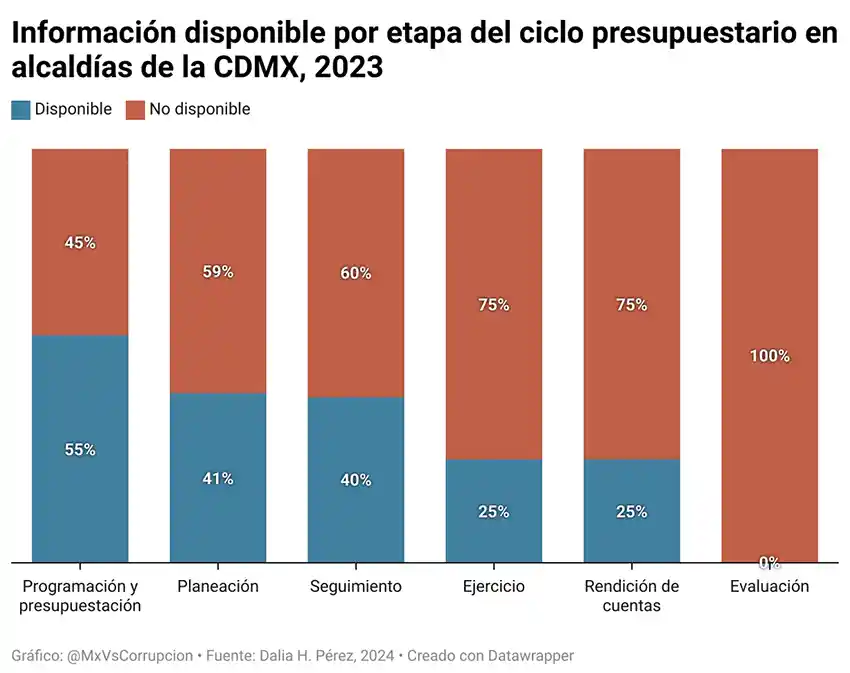 De acuerdo con el Índice de Información Presupuestaria Municipal del IMCO, desde 2016 y por lo menos hasta 2020 (último año en el que se aplicó la metodología), las alcaldías fueron los gobiernos subnacionales peor calificados de todo el país. Quedaron en último lugar con un promedio de cumplimiento de 6%. Además, conforme avanzan en las etapas del ciclo presupuestario la información disponible es más escasa y de menor calidad, como se muestra en la gráfica.