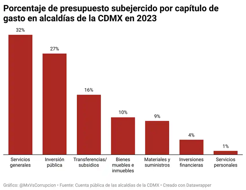 Los capítulos de inversión pública y de transferencias están dirigidos directamente al beneficio social mientras que los otros usualmente son de gasto corriente. En estos dos rubros de gasto se concentra el 43% del subejercicio de las alcaldías. Esto implica que más de 82 millones dejaron de invertirse para el beneficio público directo de la sociedad de la Ciudad de México.