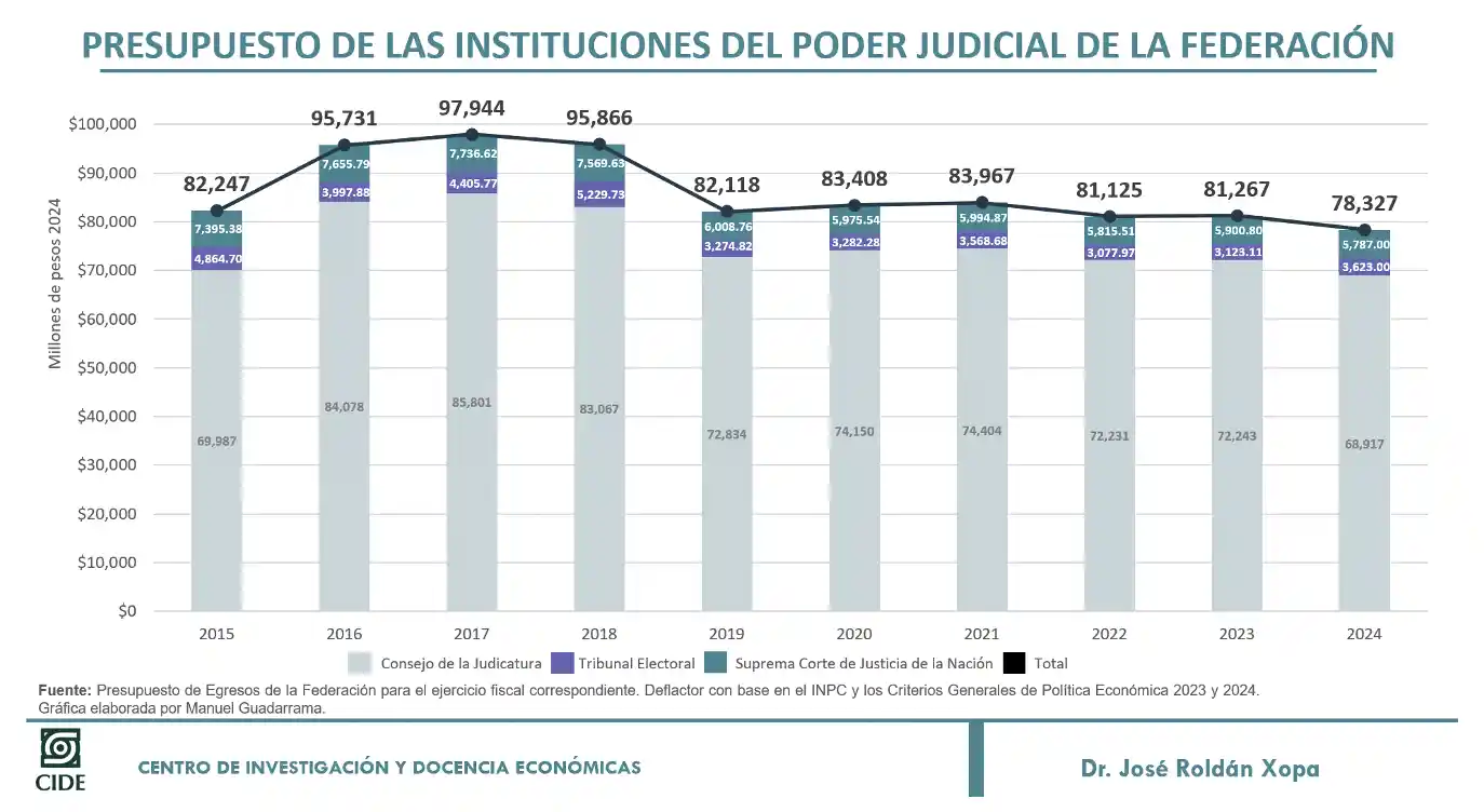 De acuerdo con un estudio reciente de México Evalúa, el presupuesto del Poder Judicial de la Federación es aproximadamente del 0.4% del PIB: una proporción menor que la que existe en Brasil, Colombia y Perú. Encima de todo, el Poder Judicial tiene cada vez más trabajo y cada vez menos dinero. El número de casos presentados ante los órganos de la judicatura aumentó en 43% entre 2010 y 2022, pero los gastos de estos órganos aumentaron apenas 19%. El resultado es que gasto por caso es más bajo. El resultado es que el gasto total judicial ha caído casi 10% entre 2018 y 2022, pero el gasto por caso ha disminuido 23%..