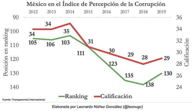 El 22 de enero, Transparencia Internacional (TI) dio a conocer el Índice de Percepción de la Corrupción 2019 (IPC). Este instrumento, que se publica cada año desde 1995, registra la opinión de analistas, empresarios y académicos de todo el mundo sobre su percepción de corrupción en 180 países. En 2019, México obtuvo una calificación de 29 puntos sobre 100 y se colocó en la posición 130. Esto significa que entre 2018 y 2019 la calificación de México aumentó un punto y su posición relativa mejoró ocho posiciones.