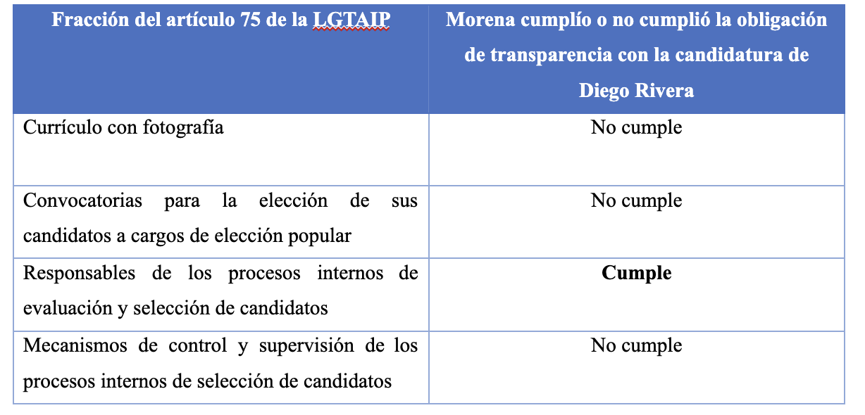 En resumen, de las 4 fracciones relacionadas con el proceso interno de selección de candidaturas que llevó a Diego Rivera Navarro a ser candidato, Morena sólo cumple con 1 fracción de las 4 a las que está obligado por la Ley General de Transparencia y Acceso a la Información Pública.