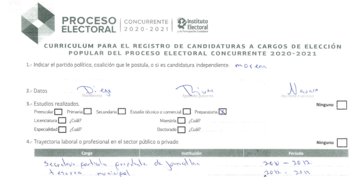 Tras una búsqueda exhaustiva de un documento similar, sólo fue posible encontrar un CV público de Rivera Navarro, que corresponde al proceso electoral 2020-2021, en el contendió por Morena para el cargo de Regidor en Tequila, Jalisco, llenado a mano.