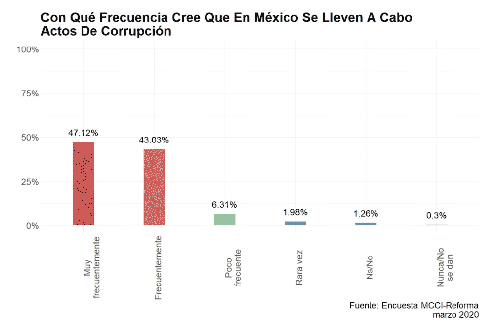 A pesar de que uno de los temas que AMLO posicionó en la campaña presidencial de 2018 fue la bandera anticorrupción, la percepción de que en México los actos de corrupción son frecuentes o muy frecuentes ha aumentado. A 14 meses de que su administración tomara posesión, 90.1 % de los mexicanos considera que la corrupción sigue ocurriendo frecuentemente y muy frecuentemente.