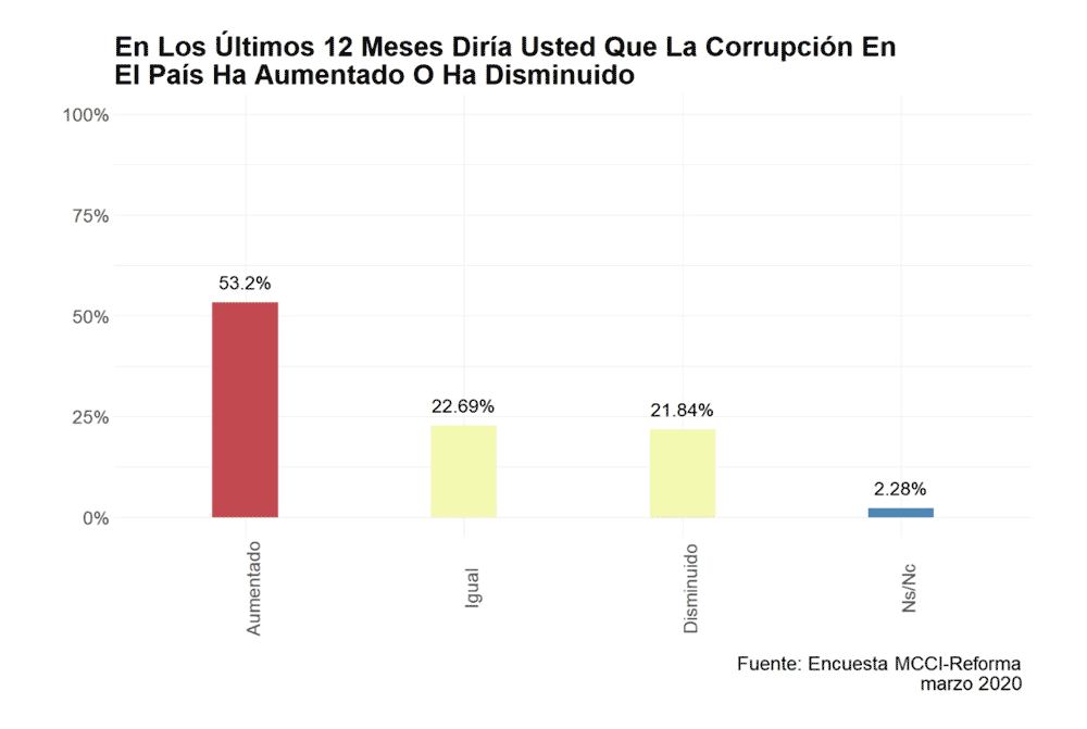La realidad es necia. La evidencia indica que las cosas no sólo no mejoraron en el frente anticorrupción, sino que de hecho empeoraron. Más personas consideran que la corrupción ha aumentado en el último año, pasando de 46.2 % en 2019 a 53.2 % en 2020. Este incremento no sólo supera el error de medición sino que marca una clara tendencia de que la gente percibe que la corrupción no ha disminuido durante el primer año de gobierno.