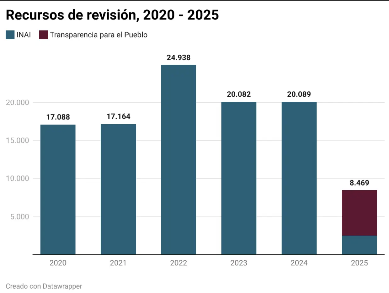 Por lo que se refiere al ejercicio 2025, Transparencia para el Pueblo atendió 5,991 medios de impugnación, hasta el 31 de octubre de 2025. Con estos resultados, es posible decir que no se cuenta con mayor información para analizar si la disgregación de autoridades para atender medios de impugnación ha impactado en la cantidad de recursos recibidos. Del mismo modo, llama la atención la proporción de recursos de revisión desechados por parte de Transparencia para el Pueblo, que corresponden a 17 asuntos de cada 100 quejas interpuestas por parte de la ciudadanía.