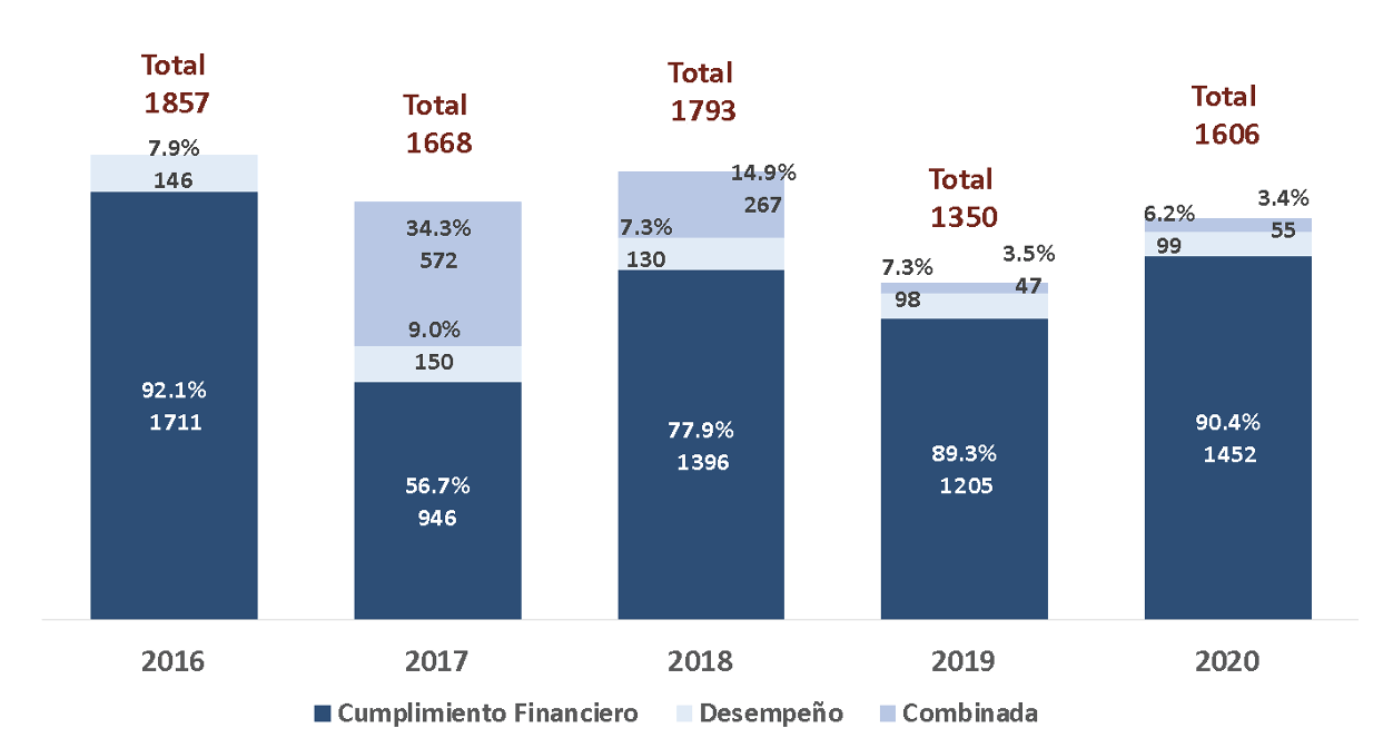 Al revisar los informes reportados de la ASF, es posible observar que, de las 8274 auditorías practicadas a las cuentas públicas entre 2016 y 2020, las de cumplimiento financiero representaron 81 % (6710), mientras que las de enfoque combinado ascendieron a 11 % (941). El resto corresponde a las auditorías de desempeño: 623 (8 %).