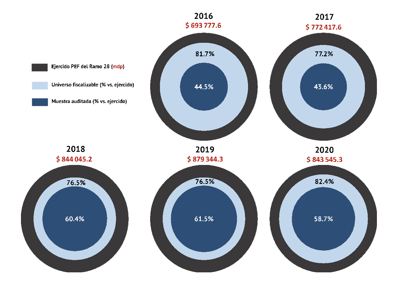 La disminución en el número de auditorías está afectando la cantidad de recursos susceptibles de fiscalización y que, por tanto, escapan a la rendición de cuentas. No solo es considerable la reducción de auditorías, también es notable que las efectuadas fiscalizan menos recursos. Muestra de ello es que en la Cuenta Pública 2016 había 2.9 pesos fiscalizados por cada peso no auditado, mientras que en las siguientes cuatro revisiones (2017 a 2020) la proporción fue uno a uno: por cada peso fiscalizado, otro no fue auditado.