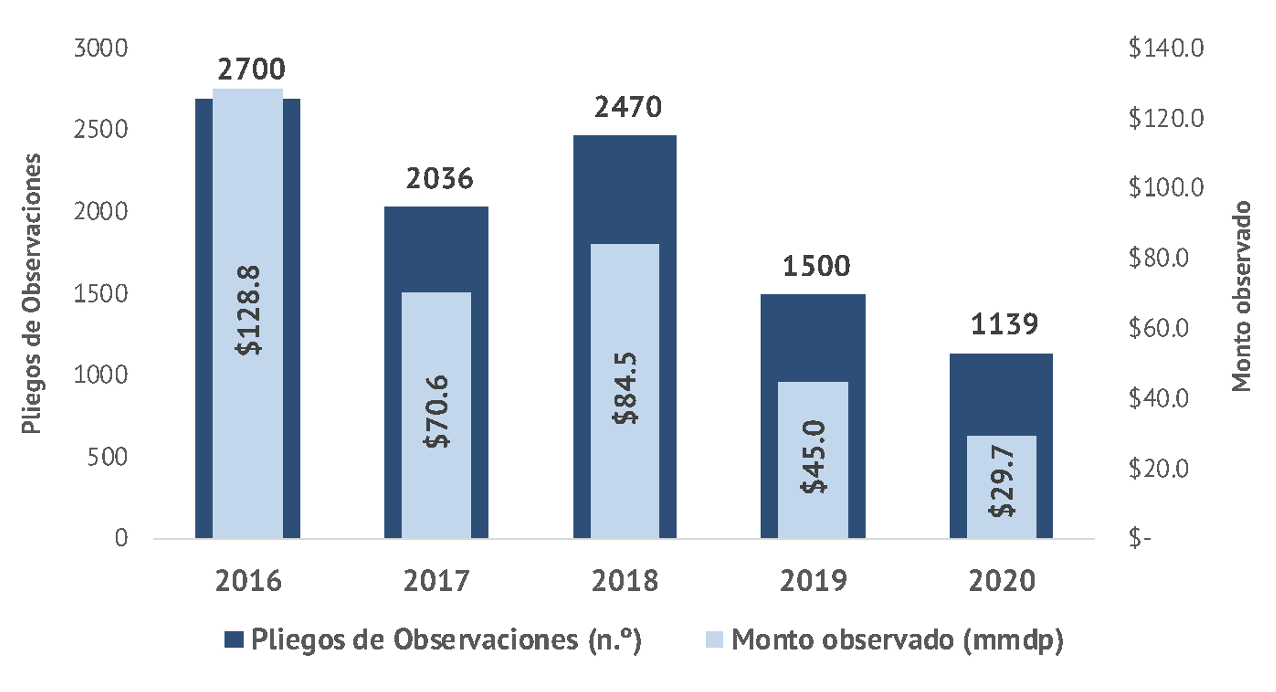 En un análisis detallado, es posible apreciar una menor cantidad de pliegos de observaciones (número de acciones) y que esta disminución ha sido más acentuada en los montos observados. Por tanto, el monto promedio por pliego ha bajado sistemáticamente entre revisiones, acumulando una disminución de 45.2 % entre las cuentas públicas de 2016 y 2020.